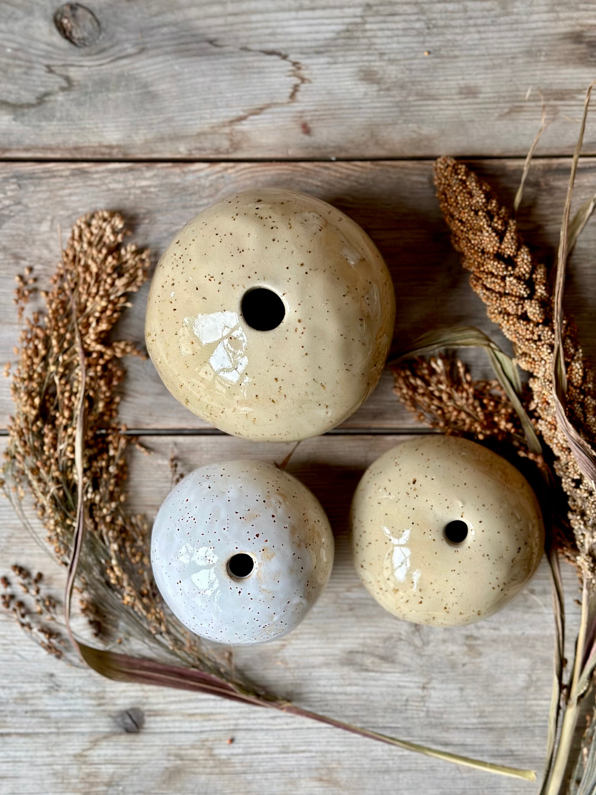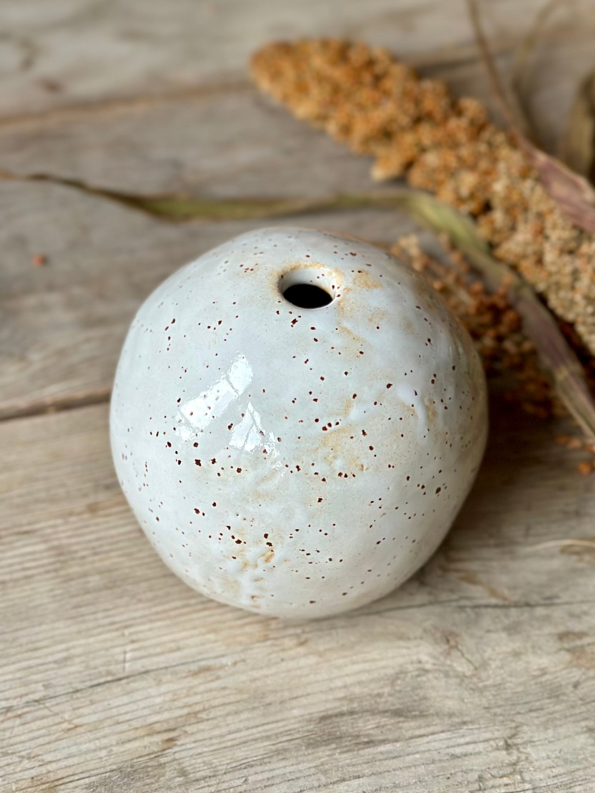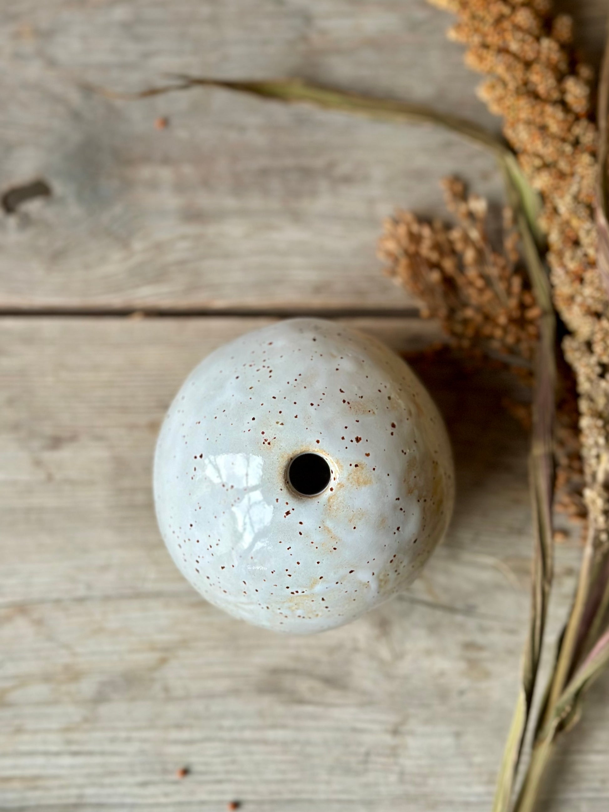 En söt liten rund vas i beige prickad stengodslera med vit glasyr.